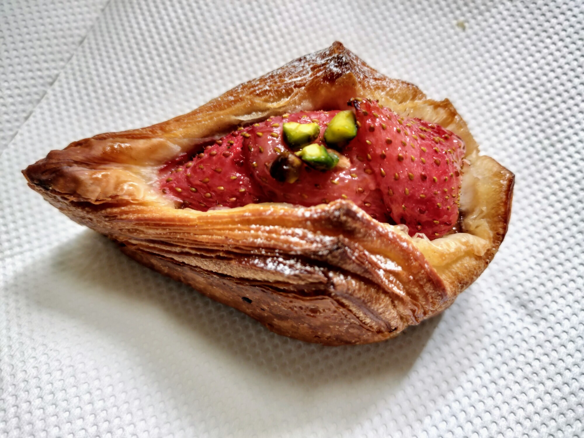 季節のフルーツ・デニッシュは、いちご(420円)。何層も重なった生地は、口の中でパリパリ・サクサクと音を立て、香ばしい香りが広がります。舟のような形なので食べやすいです。甘みを抑えたジャム状のいちごの味に春を感じ、ピスタチオの風味がよいアクセントに♪