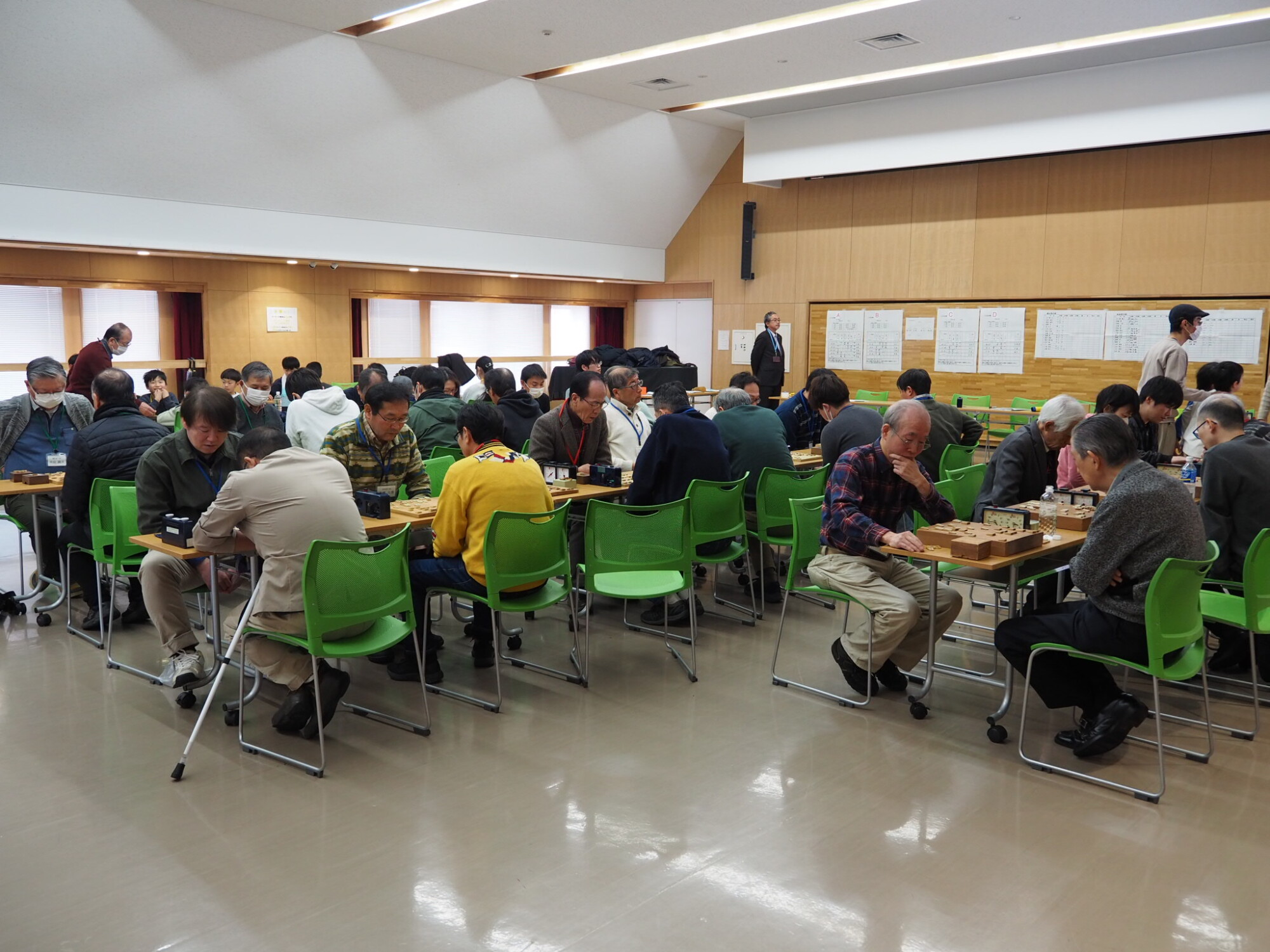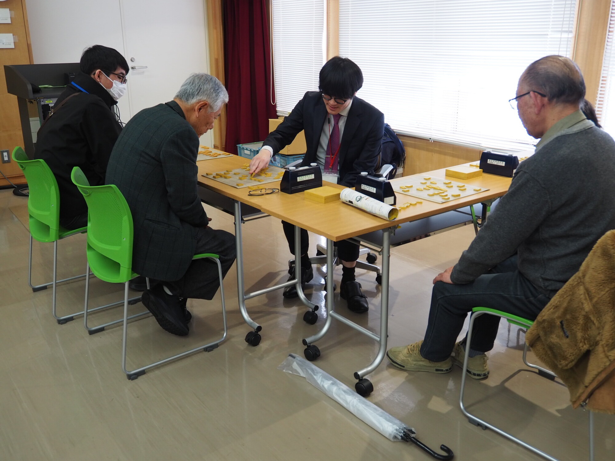 雪のため、開始時間を15分ずらして開会。子どもの部、大人の部それぞれ階級ごとに分かれて対局がスタートした。将棋盤に向かう参加者たちの表情は皆真剣そのもの。三枚堂さんとの指導対局も行われ、貴重なアドバイスに喜ぶ人の姿も多く見られた。