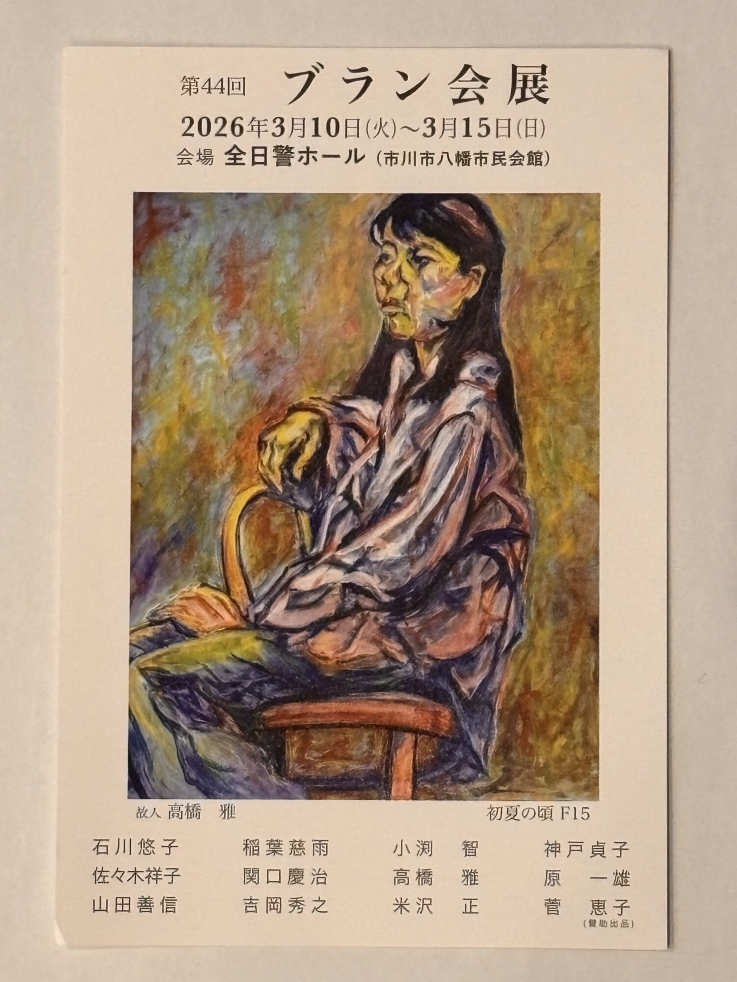 3月10日(火)から15日(日)まで、市川市の全日警ホールにて、絵画グループによる作品展「第44回ブラン会展」が開催されています 。