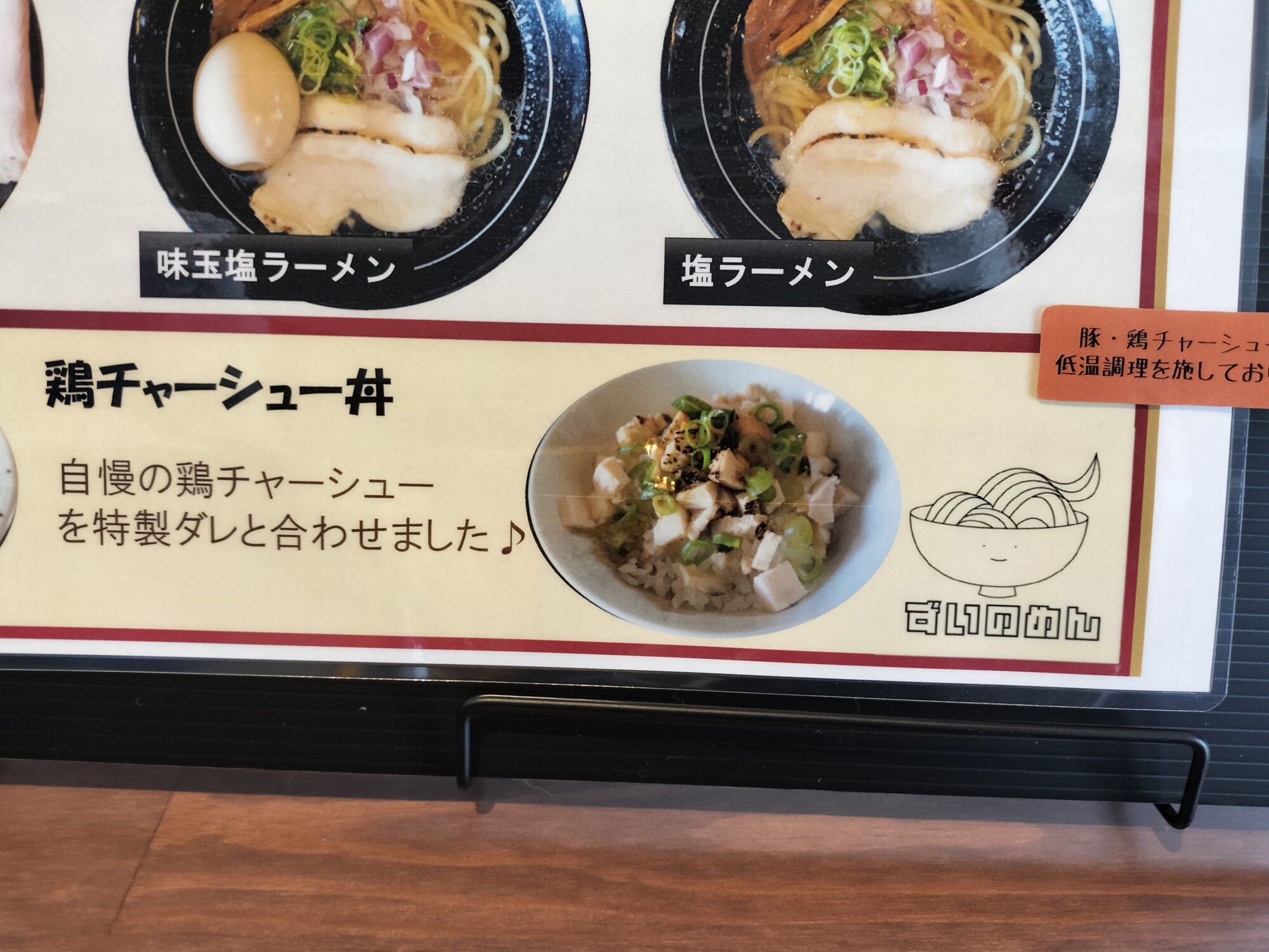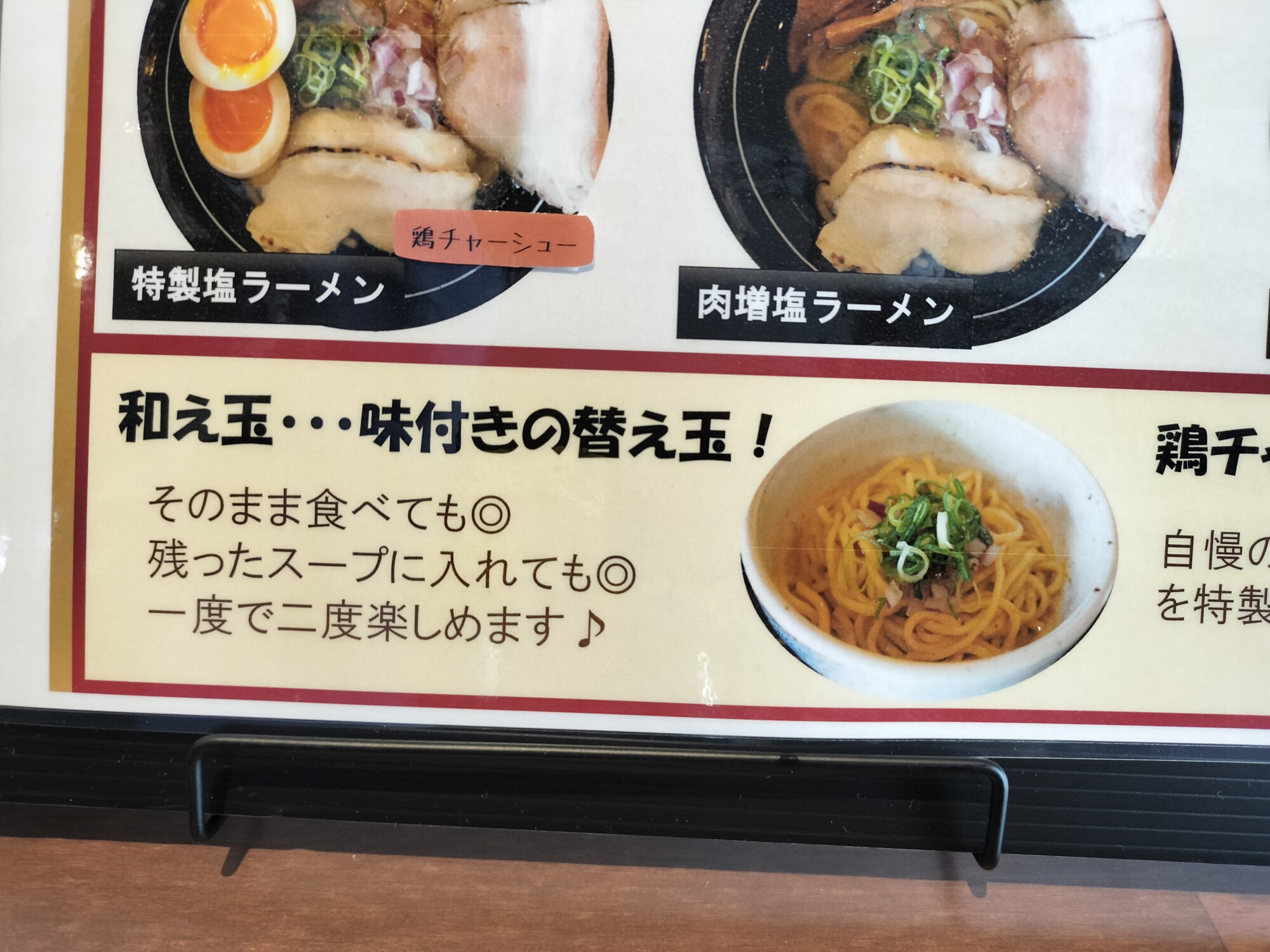 たくさん食べたい人のために、オプションメニューとして、鶏チャーシュー丼や味付きの替え玉「和え玉」も用意されています。