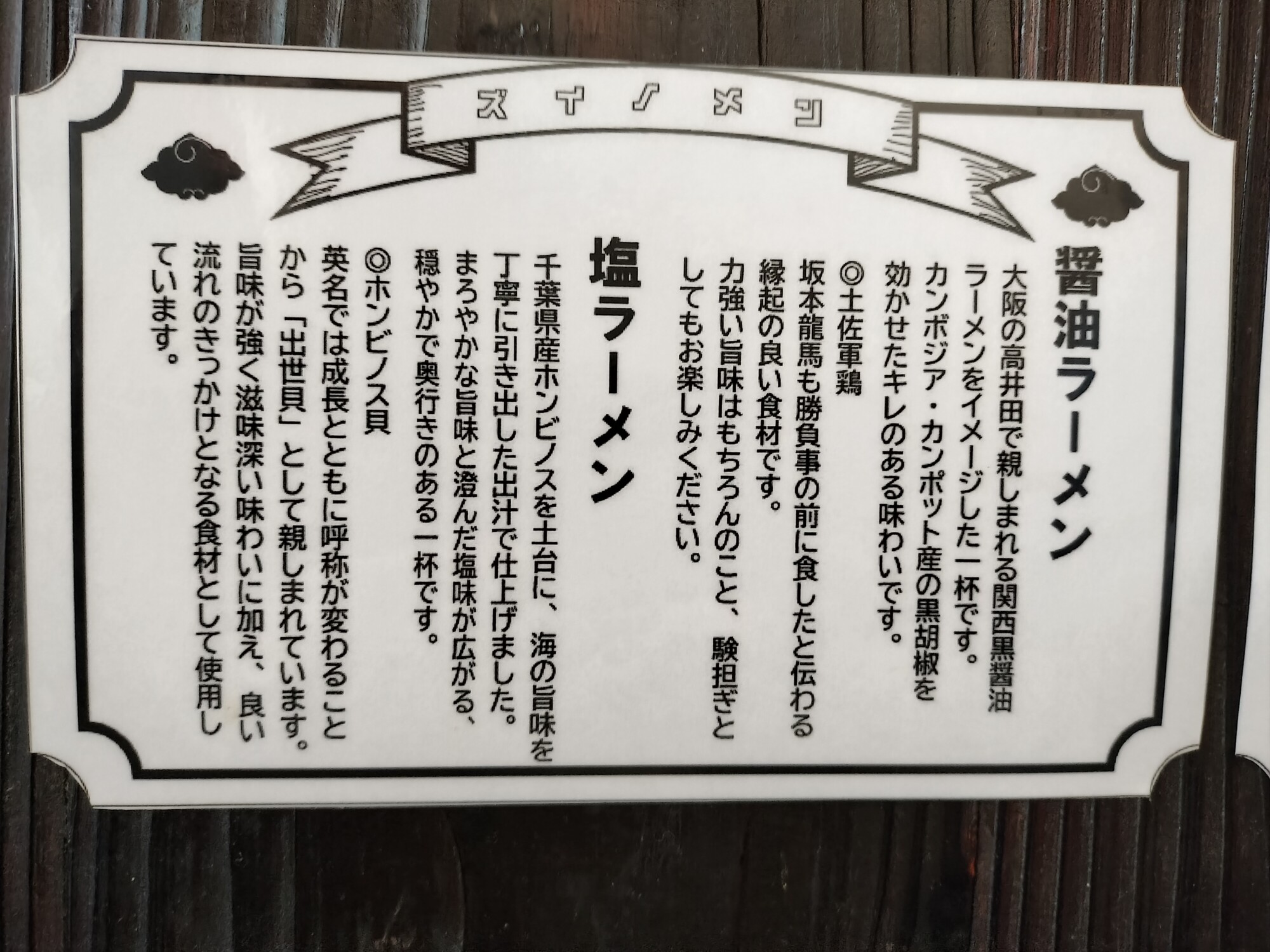醤油は、関西黒醤油をベースに、カンボジアのカンポット産の黒胡椒を効かせたもの。塩は千葉県産ホンビノス貝の旨みを土台に海の出汁あふれる一杯とのこと。味玉、豚レアチャーシューがトッピングとなっています。