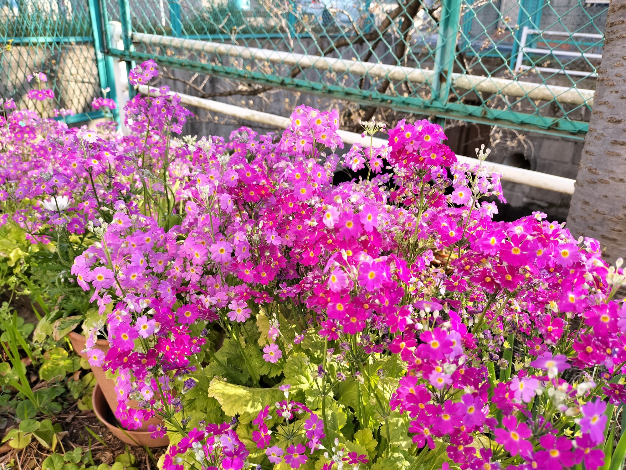 川沿いの花壇には、サクラソウやパンジーなど色とりどりの花が植えられており、エリア全体が春色に染まっています。