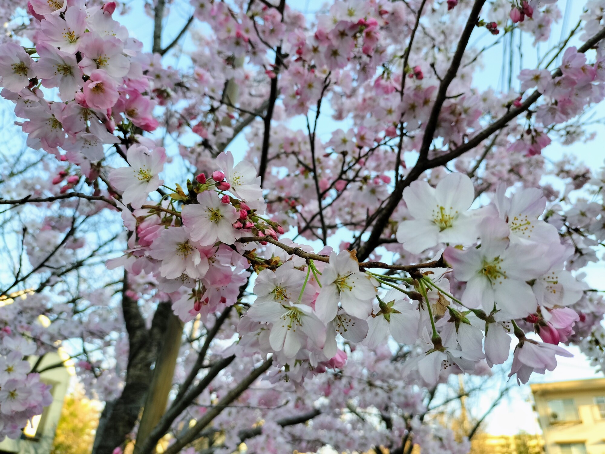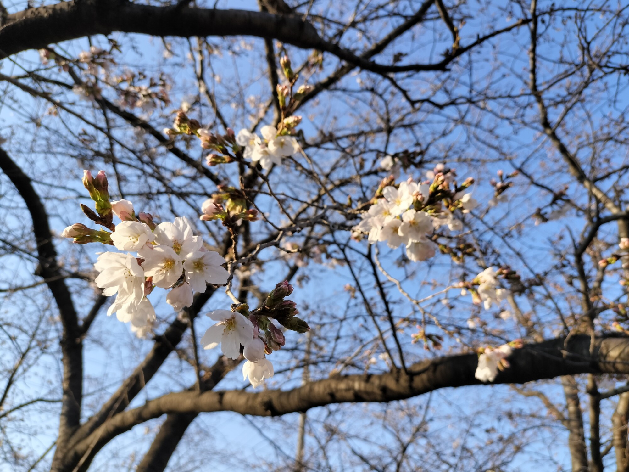 咲きたての瑞々しい花びらが青空に映える様子は、今しか見られない美しさです。このまま気温が上がれば、今週末から来週にかけて満開を迎えそうです。