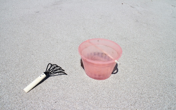 熊手は潮干狩りで砂を掘るときに使います。貝は網やバケツに入れておくと砂が落ちやすくなります。