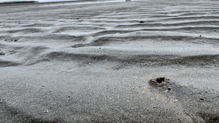 マテ貝は細長い形をした貝で、砂の中に縦に潜って生活しています。砂の表面に小さな穴があることがあり、その穴を見つけるとマテ貝がいる可能性があります。
