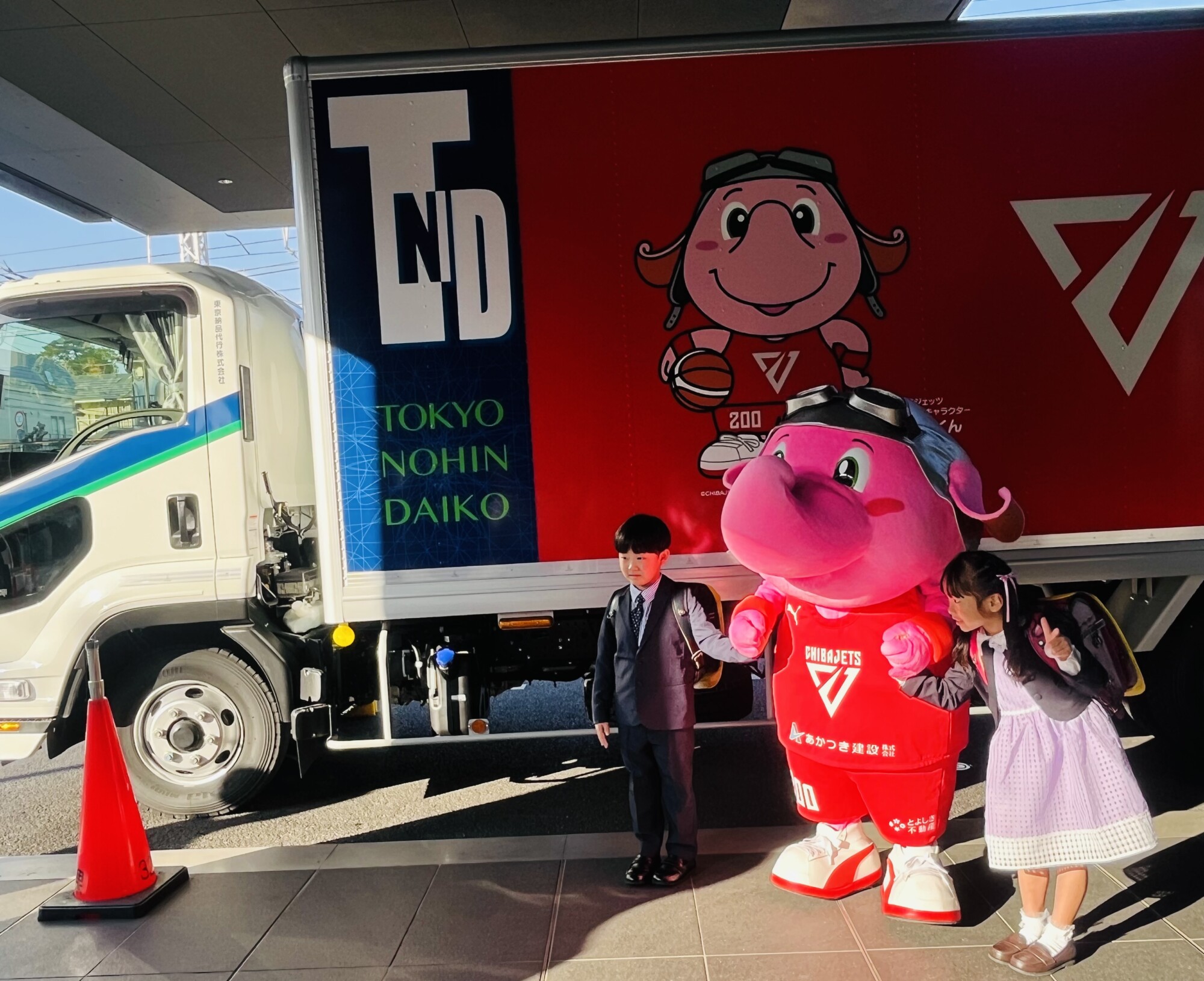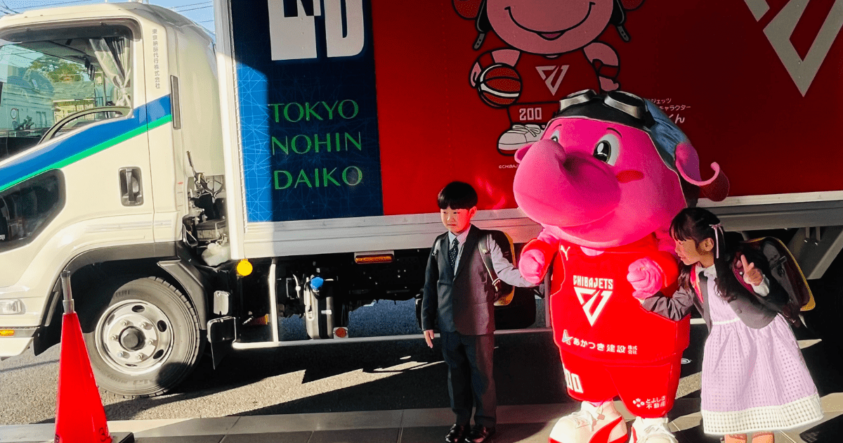 式には新1年生を代表して、田崎聖菜さんと田中澄晴さんの2人も出席し、ランドセルカバーを受け取った。カバーには千葉ジェッツふなばしの公式マスコットキャラクター「ジャンボくん」のイラストが。また、同じく「ジャンボくん」のイラストでラッピングされた東京納品代行の4トントラックも会場外に待機。子どもたちは駆け付けた「ジャンボくん」と共に記念撮影を楽しんだ。