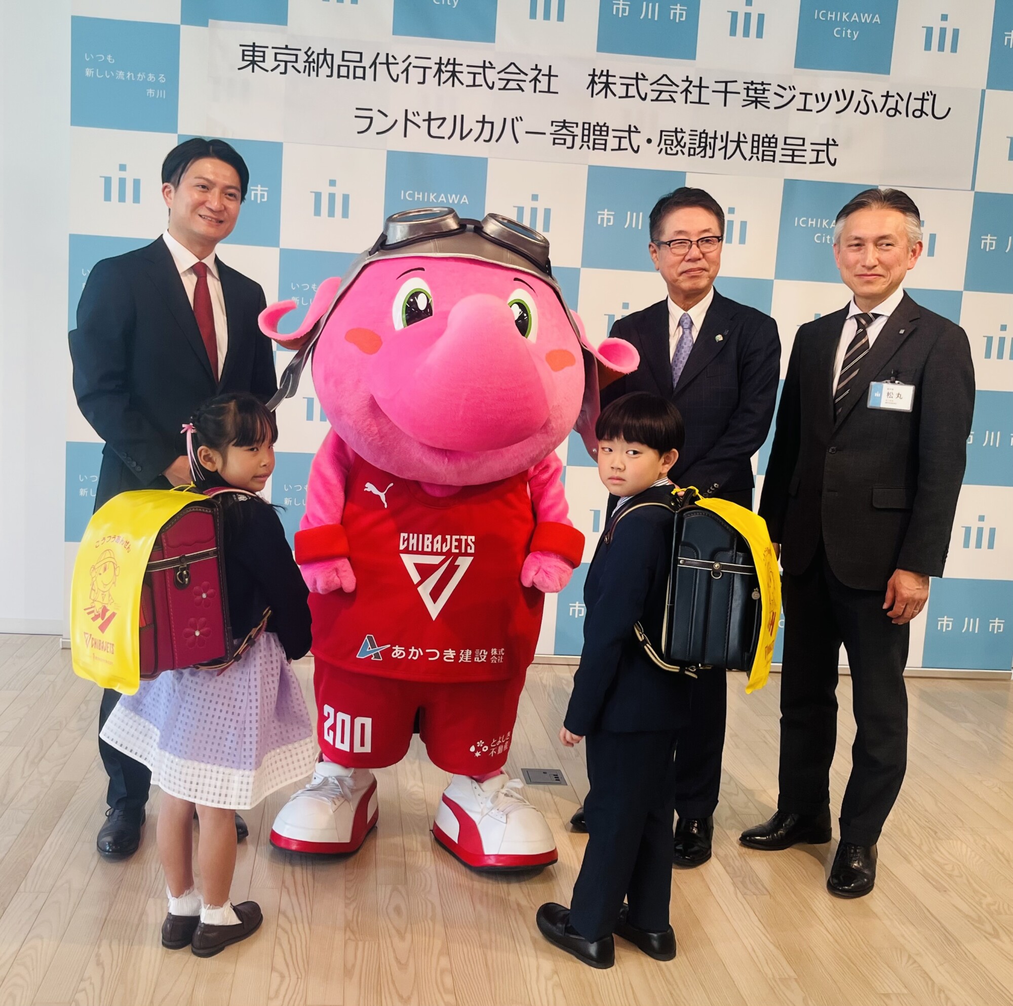 寄贈式で松丸多一副市長は「新1年生は皆この黄色いカバーを付け、安全に通学してほしい。毎年ありがとうございます」と感謝を述べた。東京納品代行の大草久社長は「運送業として無事故・無災害を常に目指しており、今後も子どもたちの安全に貢献したい」と話し、千葉ジェッツふなばしの田村征也社長も「地域に根ざし、子どもたちを守る活動を続けていく」と語った。