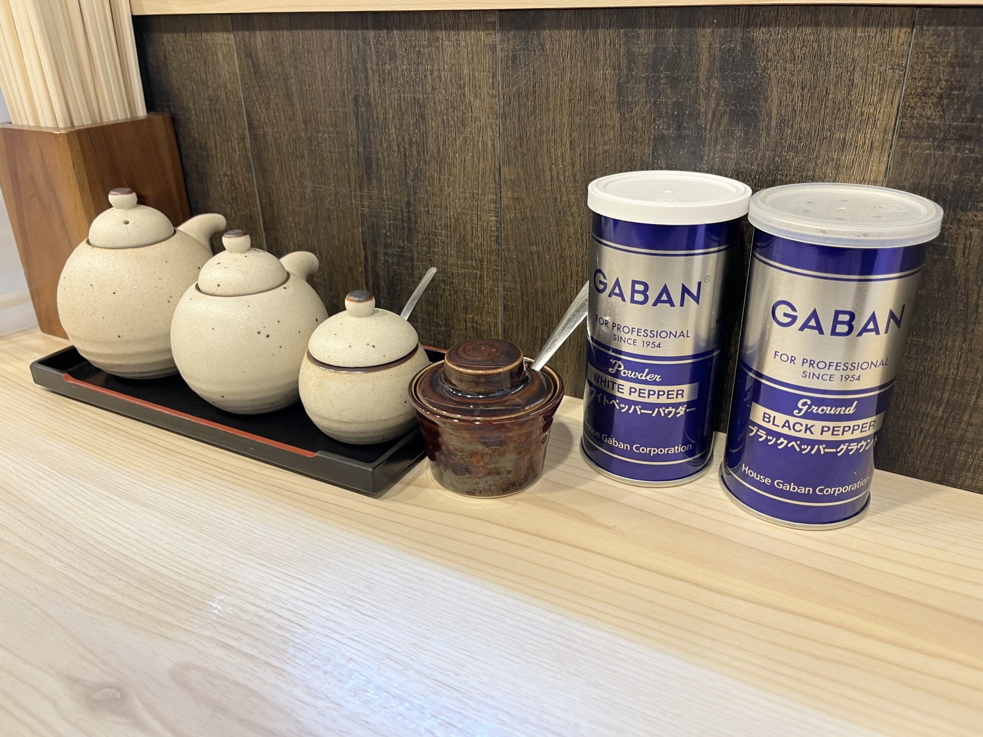 可愛らしい陶器の入れ物には、醤油・お酢・ラー油・ニンニクなどの調味料が揃っています。