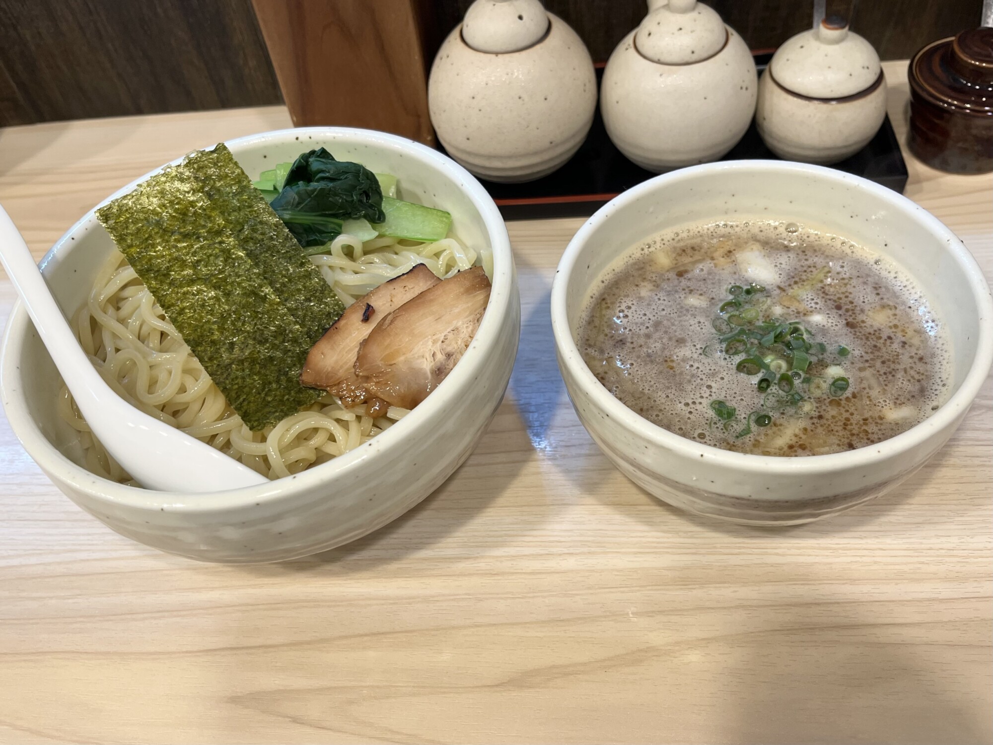 どれも魅力的で悩みましたが、今回は「濃厚つけ麺(中盛・950円)」と「白湯担々麺(950円)」を食べ比べしてみました。
