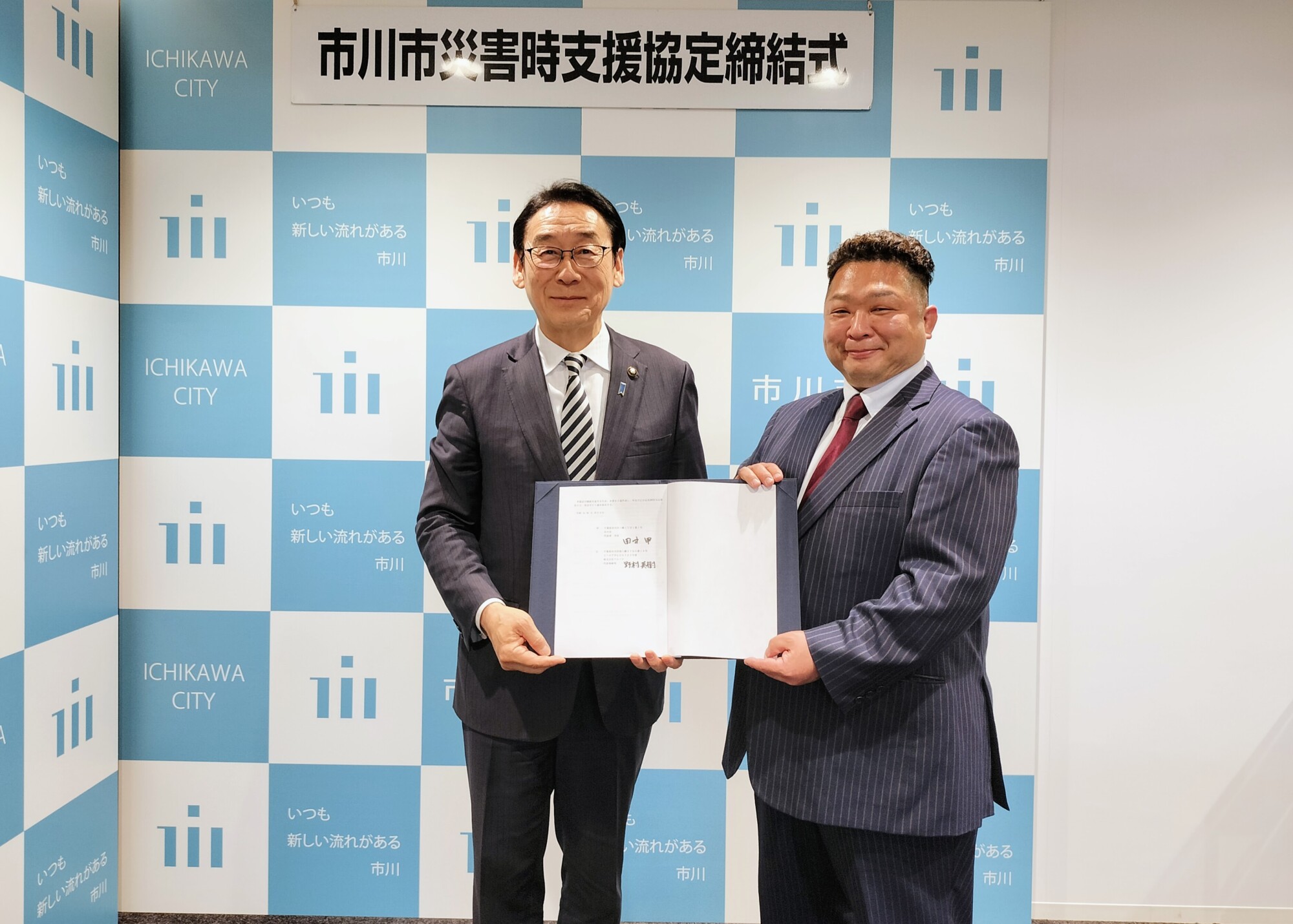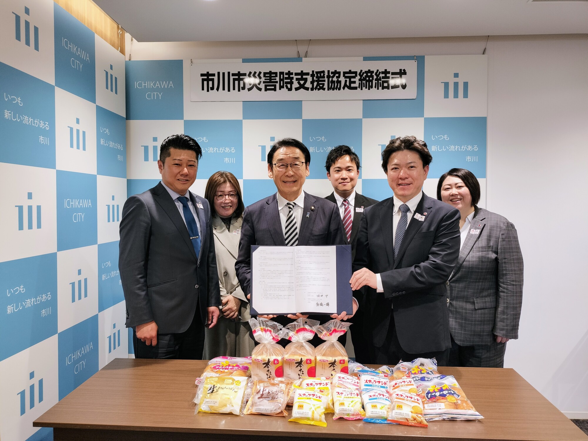 市川市は、フジパン株式会社千葉工場と株式会社マルソクの2社とそれぞれ「災害時支援協定」を結び、3月24日(火)、協定締結式を行った。各代表者とサインを交わした田中甲市長は協定について「実に心強くありがたい」と話した。
