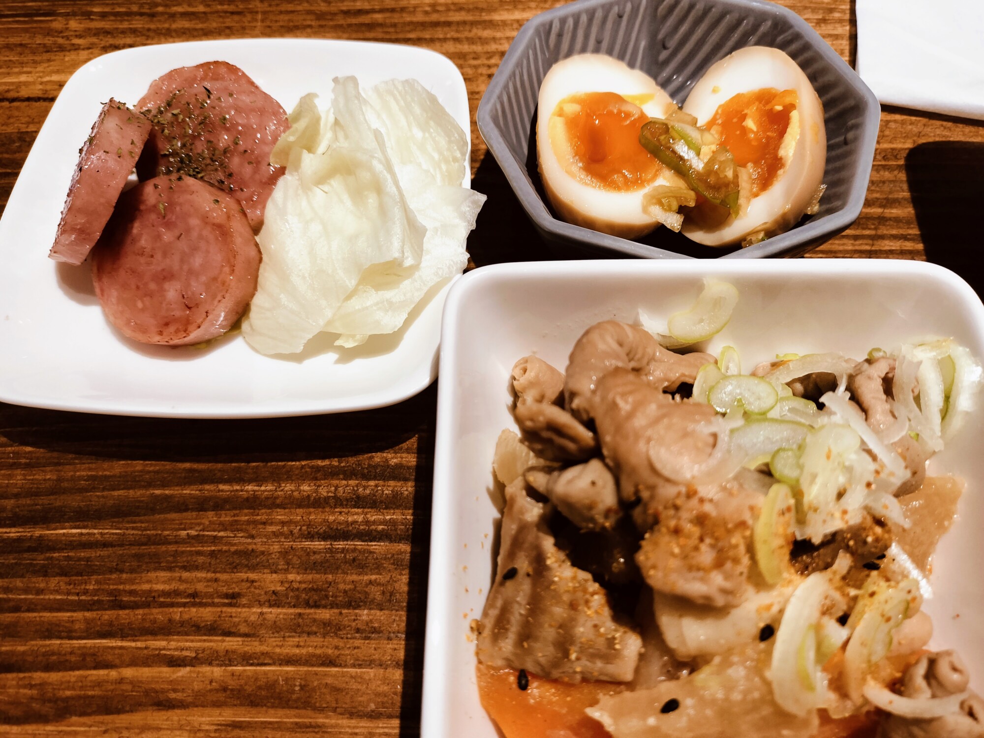 丁寧に焼かれたカリカリの雲仙ハム、黄身がトロリとした味たま、そして絶妙な味付けのモツ煮。どれも生ビールとの相性が抜群で、お酒がスイスイ進みました。