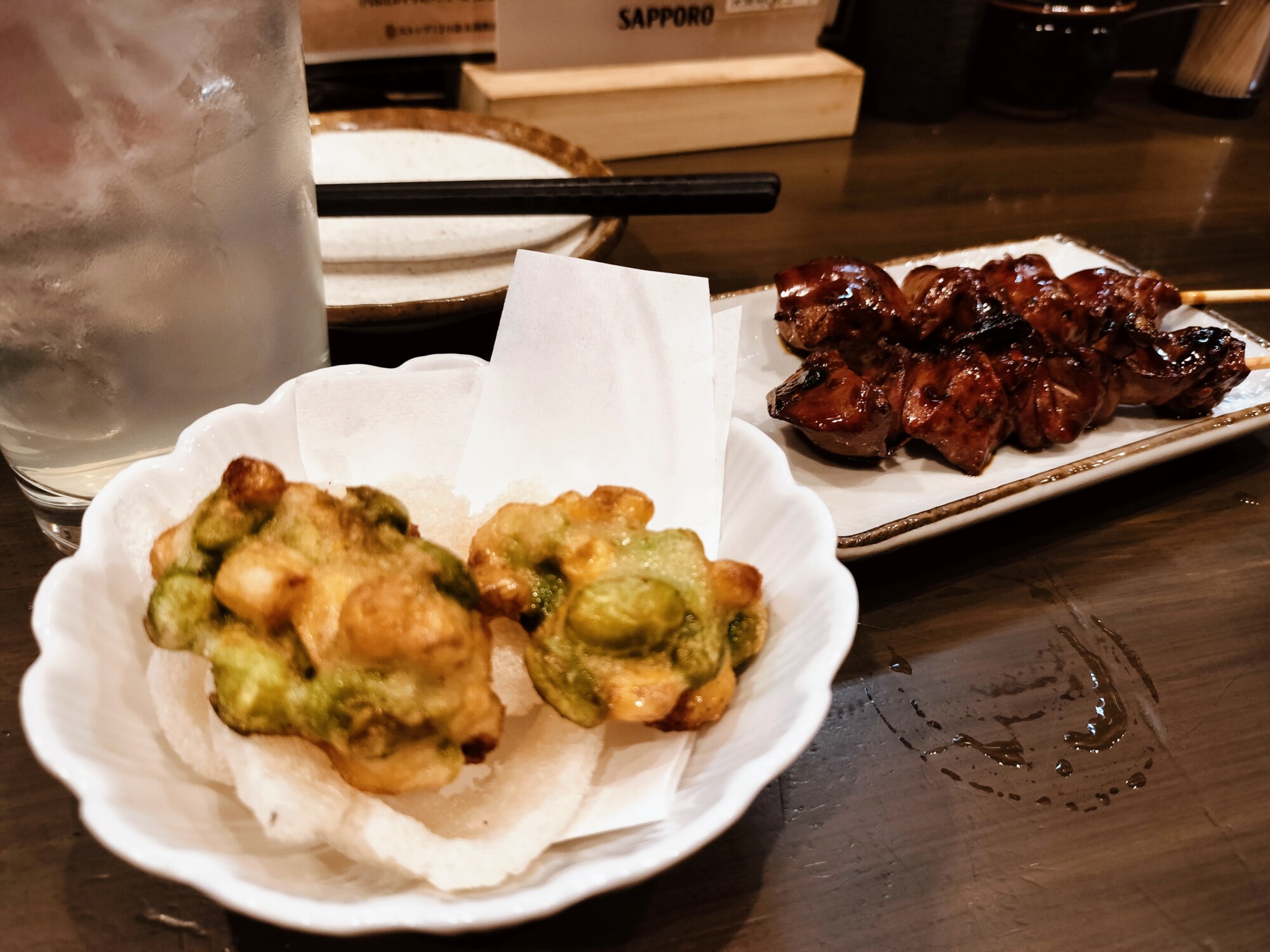 枝豆の天ぷらと特製タレがたっぷりのレバーがまず登場。