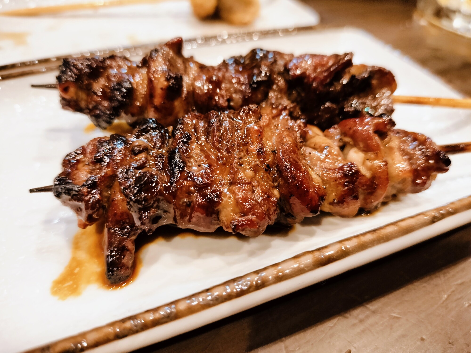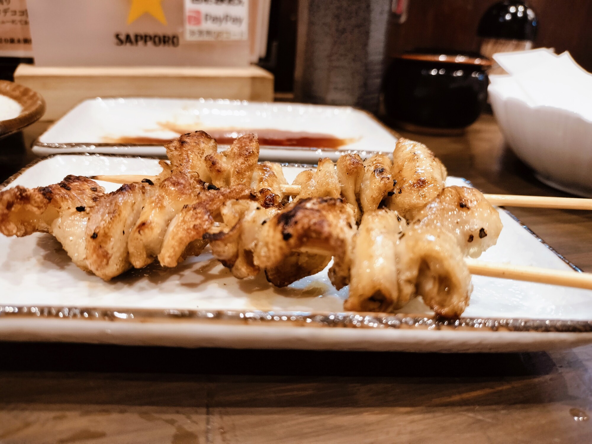 3本目、ハツオチ(タレ)。ハツオチは脂がしっかり乗っていて、噛むと濃厚な旨味が溢れ出し、炭火で焼いた焼鳥特有の香ばしさがとっても美味しかったです。