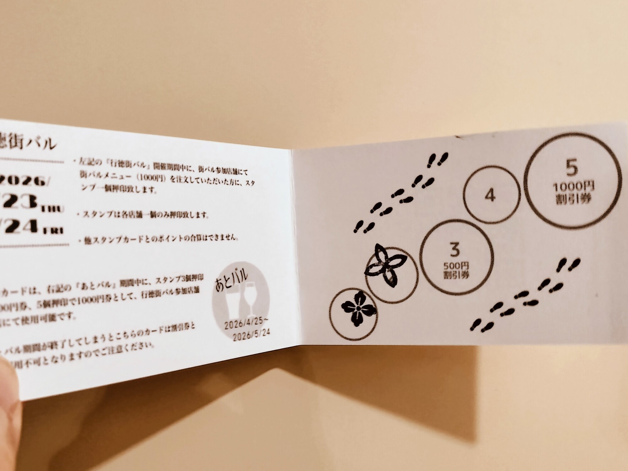 これらのスタンプカードは、2026年5月24日(日)までの「あとバル」期間中、参加店舗で割引券として利用可能です。