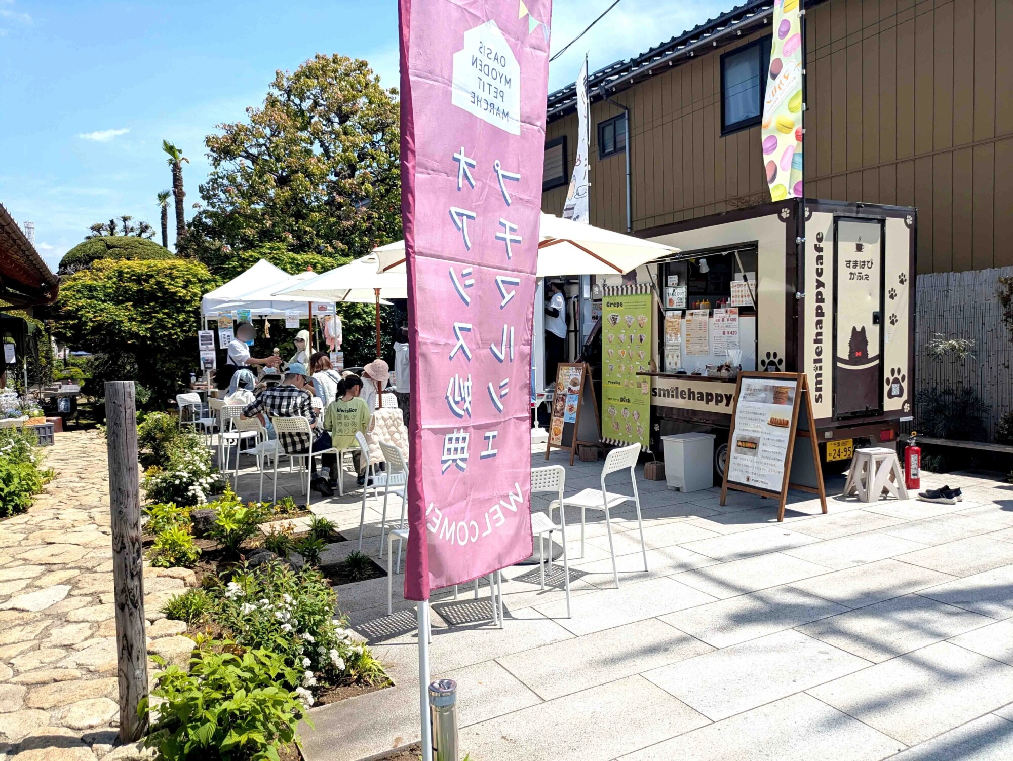 4/19(日)、オアシス妙典で開催された「オアシス妙典マルシェ」に行ってきました。築100年以上の古民家を活用した会場は、汗ばむ陽気の中でも多くの人で大賑わい。クレープなどのキッチンカーやハンドメイド雑貨が並び、女性のお客様さまが多く見られました。