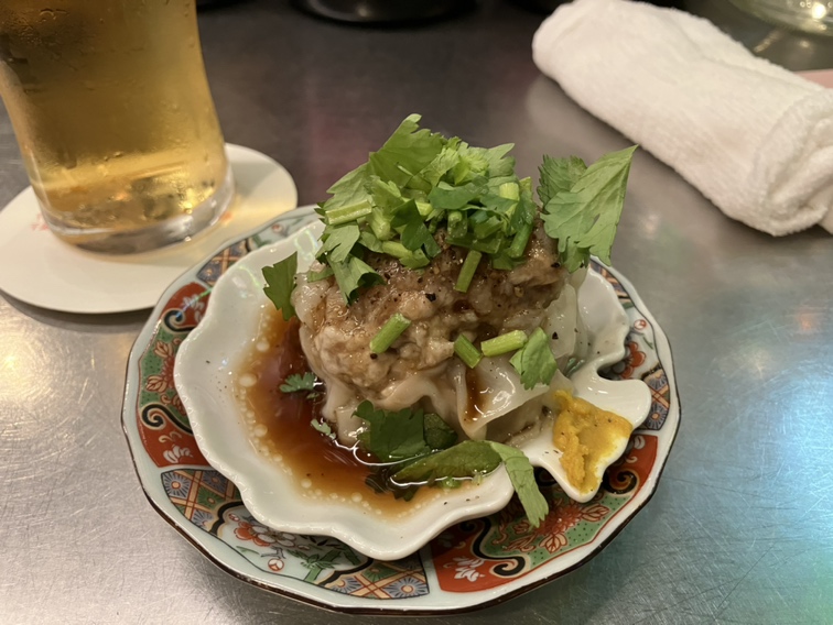 写真は「大衆立呑倶楽部CUE」さんのバルメニュー「仔羊クミン焼売(パクチーのせ)」です。ジューシーでとても美味しかった~また行徳街バル参加したいです♪